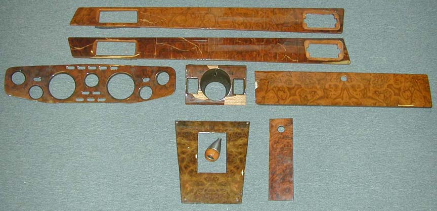 Below is a full set from a 1952 Aston Martin Lagonda. It came to us in “basketcase” condition - The veneer was blistering and peeling off, the finish had seen its’ last days and was non-existent on many parts, and the wooden substructure was cracked and broken. All indications were that it had been poorly restored at least one time before. |