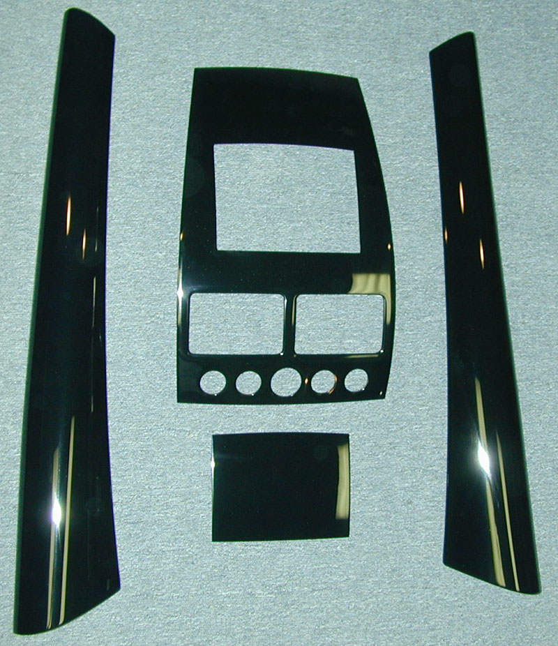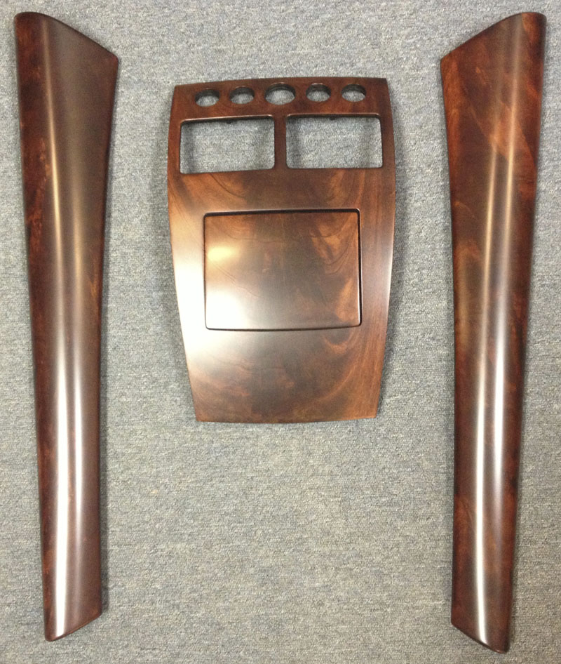 Below are pictures of the woodwork in a 2000 Aston Martin DB7. The effects of UV exposure, heat and time have affected the parts differently. Some parts appear to be in pretty good shape “colorwise”, but are developing hairline cracks in the finish. The console and ashtray changed color differently over time, and the finish on the center vent panel and the radio / temperature control panel turned very “cloudy”. Because each of these conditions affect the veneer on these parts differently, it is essential to refinish all the parts at one time.