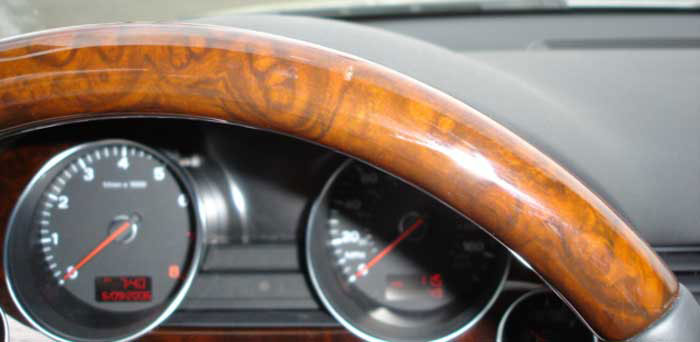 In addition to the various “real wood” Audi parts we get in for restoration – Steering Wheels get a lot of abuse. This one from an A8, had been chipped and scratched up pretty badly – probably from a ring. |